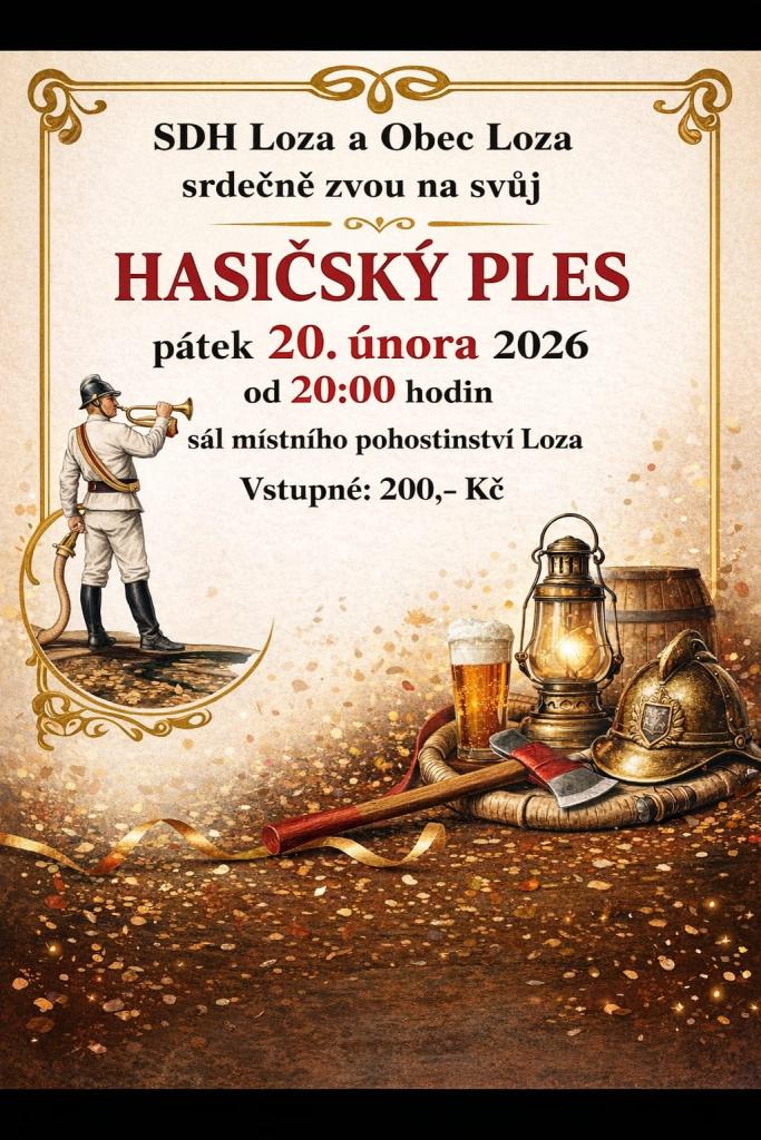 V pátek 20. února 2026 se uskuteční hasičský ples pořádaný SDH Loza a obcí Loza. Akce začne v 20:00 hodin v sále místního pohostinství, kde si můžete užít zábavu a setkat se s přáteli.